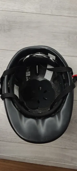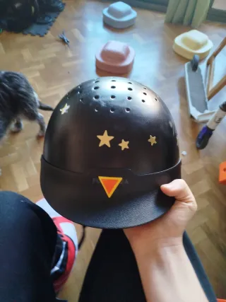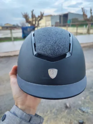 Casco de equitación en color negro, talla 54 cm. Presenta un diseño con rejilla frontal para ventilación. - Talla: 54 cm Lo usó mi hija con 9 años en tan sólo unas 15 clases de hípica. Tiene algún rasguño en la parte delantera pero no es de caídas, es de no protegerlo durante los transportes. Yo soy mujer con estatura de 1,53 m y también se me ajusta bien. El enganche de barbilla es adaptable. Nuevo está en 50 euros en el decathlon.