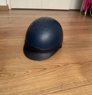 Casco de hípica de la reconocida marca Casco. Diseño elegante en color azul. - Talla S (52-56 cm). - Modelo: Choice - Ventilación superior. - Detalle de banda plateada. - Hebilla de ajuste. Nunca se ha llevado un golpe por caída, sólo los roces del uso.