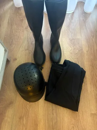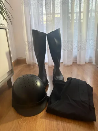 Conjunto básico de hípica en color negro. - Casco de hípica con ventilación. - Pantalón de hípica. - Botas altas de hípica.