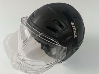 Casco de hockey marca Sitka, talla S. Diseñado para ofrecer protección y comodidad. - Color negro. - Visera transparente incluida- tiene una raja en el visor de un pelotazo