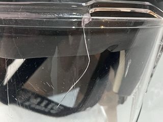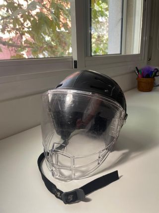 Casco de hockey negro con visor transparente. - Material resistente. - Diseño ajustable. -un poco rayado en el visor trasparente -S