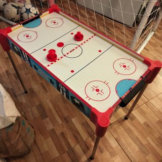 Mesa de hockey de aire para diversión en casa. Ideal para niños y adultos. - Diseño colorido con temática deportiva. - Patas plegables para fácil almacenamiento. - Incluye dos mazos y dos discos. - Incluyo pilas. Ésta cascada la tapa de las pilas pero se sujeta perfectamente con cinta americana,por eso bajo el precio Medidas: alto 63 , ancho x largo 43x78