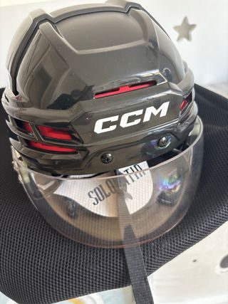 Casco de hockey CCM en color azul, talla L. Diseñado para ofrecer protección y comodidad en el juego. Usado durante una temporada - Marca: CCM - Talla: L - Color: Azul
