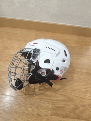 Casco de hockey CCM en color blanco con reja protectora. - Marca: CCM - Color: Blanco - Incluye reja protectora