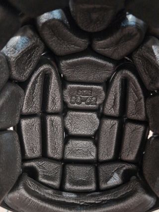 Casco de hockey blanco con rejilla metálica. No sabemos la talla. Mi hija tiene un perímetro de 56 56 cm y este casco se regula para perímetros más grandes o más pequeños. Están buenas condiciones aunque presenta alguna marca de óxido. Nada importante Se adapta a varias tallas. 11-14 años - Rejilla protectora de alambre. - Cierre de correas.
