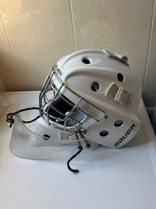 Casco de portero de hockey de la marca Bauer. *Precio negociable* - Color blanco. - Diseño de rejilla frontal. - Protector facial transparente.