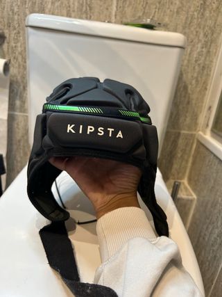 Casco de protección Kipsta para hockey sobre patines. Diseñado para ofrecer seguridad y comodidad. - Color negro con detalles en verde. - Cierre ajustable con velcro. - Material acolchado para mayor protección.