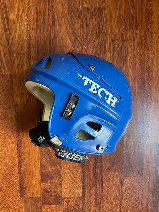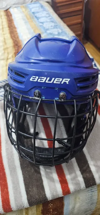 Casco de hockey marca Bauer en color azul. Diseñado para proteger la cabeza durante el juego. - Marca: Bauer - Color: Azul - Incluye reja protectora negra.