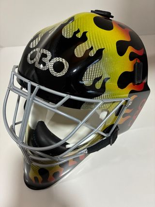 Casco de hockey hierba F/G de la marca OBO de adultos.Diseño con llamas en negro, amarillo y rojo. - Diseño con llamas. - Marca OBO.