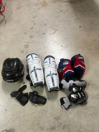 Conjunto de equipación de hockey sobre hielo. - Incluye espinilleras. - Incluye coderas. - Incluye guantes. - Incluye peto. - Incluye casco con reja.