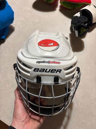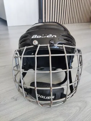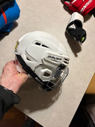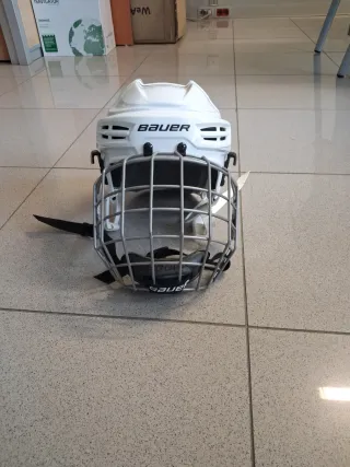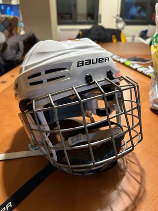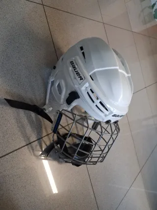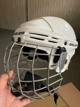 Casco de hockey marca Bauer en color blanco. Talla S. Se encuentra en estado, seminuevo. - Carcasa de plástico. - Ajuste cómodo con correas y posibilidad de extender o recoger unos milímetros para mejor ajuste de la cabeza. - Muy resistente con rejilla metalica