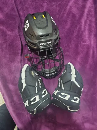 Conjunto de equipo de hockey CCM que incluye casco y guantes. - Casco de hockey CCM negro con detalles blancos y amarillos. - Guantes de hockey CCM negros con detalles blancos y el logo CCM en grande.