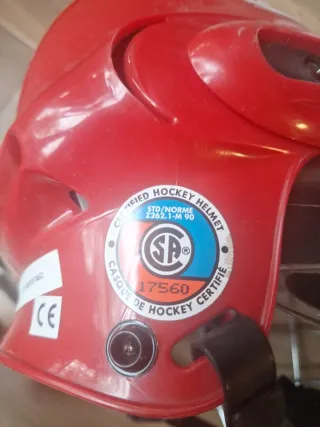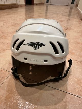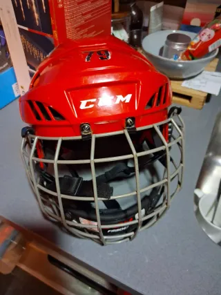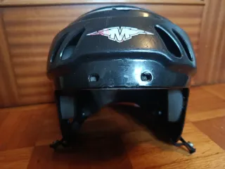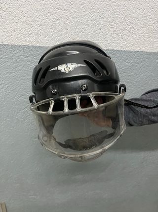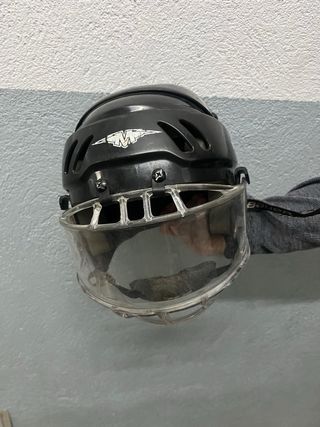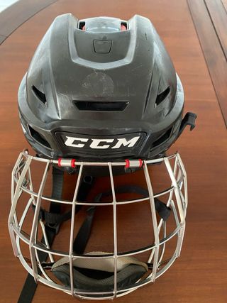 Casco de hockey CCM con reja protectora. -Talla S - Color negro. - Reja metálica plateada. - Cierres de seguridad. -Le falta el protector de una oreja -Ideal para principiantes. Todavía tiene vida. Mi hijo ya no lo usa porque le quedó pequeño.