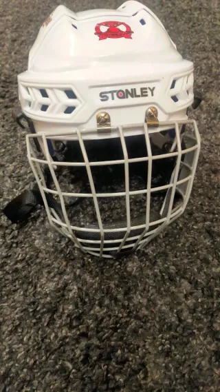 Casco de hockey marca Stonley en talla M. Diseñado para proteger la cabeza durante el juego. - Color blanco. - Incluye rejilla protectora frontal. - Cierre ajustable.