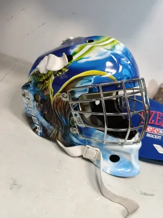 Casco de hockey CCM en color negro. - Diseño protector para portero. - Rejilla frontal metálica. - Cierre con correas ajustables.