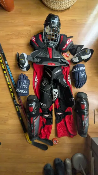 Conjunto completo de equipación para hockey, apto tanto para línea como para hielo. Incluye todo lo necesario para jugar. Ideal para alguien que empieza! Se aceptan ofertas :) - Casco blanco (es negro, pero esta forrado cn cinta americana) con rejilla. - Guantes de protección Bauer. talla 13'' 33cm - Espinilleras Bauer, talla 13''33cm - Coderas rbk jofa - Pantalon protector mision - Patines de hockey, tour, necesitan ruedas :) (talla 41/42) - Bolsa de transporte azul y negra, tipo mochila. - Stick no sala en la foto