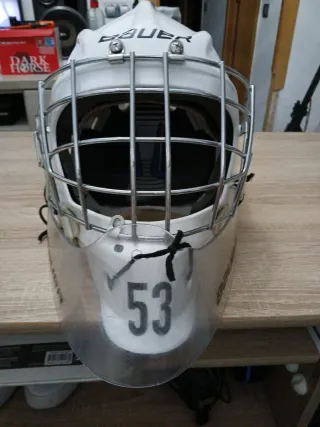 Casco de portero de hockey sobre hielo marca Bauer. Diseñado para ofrecer protección y comodidad en la cancha. - Color blanco. - Talla SR - Incluye reja protectora. - Visor transparente. - incluye babero