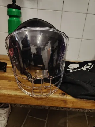 Casco de hockey para jóvenes con protector facial transparente. Muy poco uso (2 partidos), está en estado perfecto. Nuevo vale 120euros. - Con funda - Con recambios zona interior - Diseño en color negro. - Correas ajustable para mayor seguridad. - Protector facial de policarbonato.