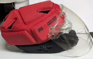 Casco de portero de hockey en color rojo. Diseñado para proteger la cabeza. - Diseño clásico. - Rejilla metálica frontal. - Correas de sujeción ajustables nuevas. Para hoquei patines hielo i línia En Girona o també a Bigues i Riells Hoquey hockei patins porter
