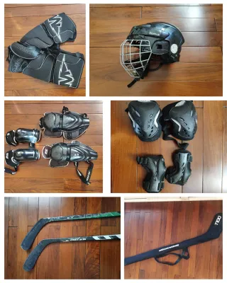 Conjunto completo de equipación de hockey para niños, ideal para edades de 8 a 9 años. - Casco Bauer con reja. - Guantes de hockey Winnell. - Espinilleras CCM. - Coderas de hockey Winnell - Stick Hochey Winnwell - Funda Stick
