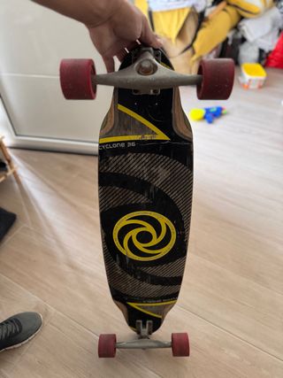 Skateboard (tabla de skate) Cyclone 36 con ruedas rojas. - Diseño con espiral amarilla. - Tabla de madera con detalles gráficos. - Se vende con casco incluido.