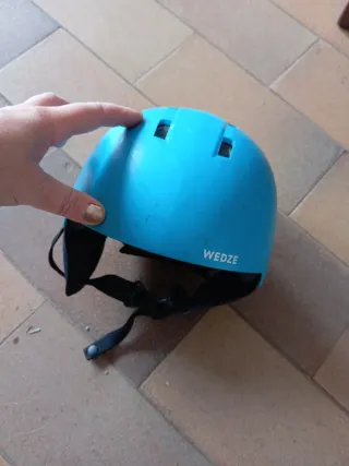 Casco para niños usado, ideal para esquí, snowboard o skate. Tiene algunos pequeños arañazos, pero está en buen estado general. Tiene pinza para frontal o gafas de esquí. - Marca: Jed2e - Color: Azul turquesa - Talla: (A determinar según medidas) - Ideal para deportes de invierno y actividades al aire libre.