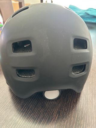 Casco negro de Decathlon (Oxelo de 55-58 cm) con rueda para ajustar la medida en muy buen estado, sin golpes pero con algunos rasguños. Perfecto para usar con patinetes, patines y/o skate.