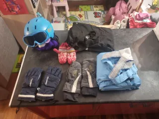 Conjunto de esquí para niños, ideal para disfrutar de la nieve con seguridad y comodidad. Incluye casco, gafas, pantalón y guantes. - Casco de esquí azul. - Gafas de esquí con lente oscura. - Pantalón de esquí azul. Talla 6-10 años. - Pantalón de esqui negro. Talla 5-6 años. - Guantes de esquí azules. - Guantes de esquí rosas y blancos. - Manoplas de esquí grises Pack perfecto para bo tener que gastar mucho dinero.