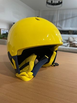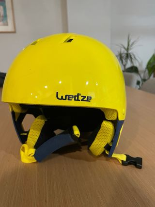 Casco de esquí de color amarillo brillante, ideal para protegerte en las pistas. - Interior negro con acolchado. - Correas de sujeción ajustables. Casco de Esqui Wedzee KD 500 del Decathlon de color amarillo fosforito, ideal para distinguir en la nieve. Es de talla de 48-52 cms de cabeza, aunque lo recomiendo para cabezas más pequeñas también. Además, lleva ruleta ajustable a la cabeza. Tiene algún rasguño pero esta bien cuidado.
