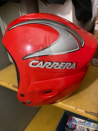 Casco de esquí para niños en color rojo brillante. Marca Carrera. Diseñado para proteger durante actividades en la nieve. Talla S (55-56) - Diseño deportivo con detalles plateados. - Interior negro acolchado.