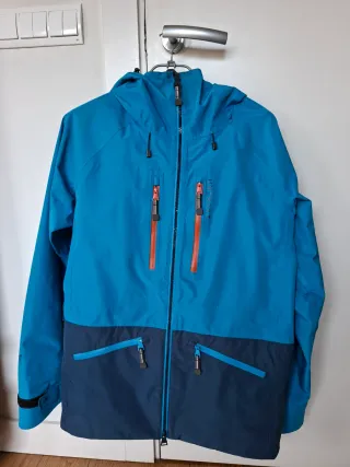 Chaqueta UNTRAKT de esquí con tecnología impermeable 3L. Talla L. Diseñada para ofrecer protección y comodidad en la montaña. - Color azul claro y azul marino. - Cremalleras frontales y de bolsillo en color naranja. Todas las cremalleras termoselladas. - Capucha integrada y ajustable al casco. - Puños ajustables.