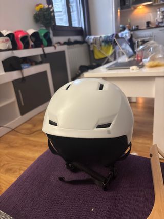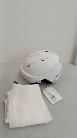 Casco de esquí de la marca Salomon en color blanco. Diseñado para ofrecer protección y comodidad en la montaña. - Diseño moderno con detalles geométricos. - Interior forrado para mayor confort. - Correa ajustable con cierre de seguridad. Esta en perfecto estado exceptuando la zona de las orejeras