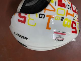 Casco de esquí de la marca Elan con un diseño moderno y llamativo. - Color blanco con números y letras decorativas. - Talla 52-56. - Peso 315 g.