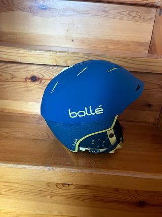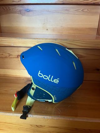 Casco de esquí de la marca Bolle en color azul. - Diseño moderno y deportivo. - Detalles en amarillo y textura en la parte inferior. - Logo de la marca visible. -Peso 490g -54-58cm -Casco junior Incluye funda del casco.