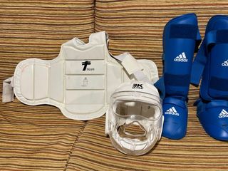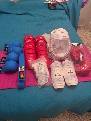 Conjunto de protecciones para la práctica de karate. Incluye casco, antebrazos daedo, peto y cinturones. - Cascos blanco de protección. Arawaza y daedo. 55€ y 30€ - antebrados daedo 10€ - Peto protector. 35€ - Cinturones de karate (rojo y azul). 5€