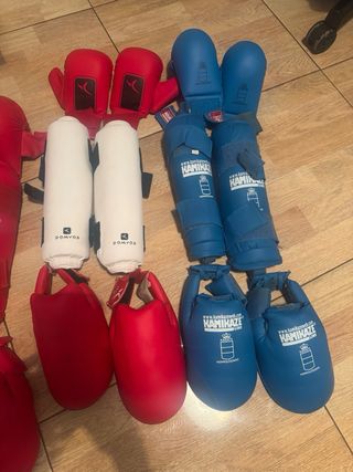 Se venden protecciones de karate homologadas. - Incluye dos cascos, dos pares de espinilleras (una azul y otra roja) - Las espinilleras rojas son de la marca Wacoku. - Las espinilleras azules son de la marca Laguna. - 1 Protector de cuerpo. Solamente trato en mano no hago envíos.