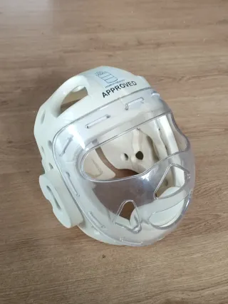 Casco de protección para karate con certificación oficial. En buenas condiciones. -Tamaño L. - Diseño homologado para competiciones. - Protección facial transparente.