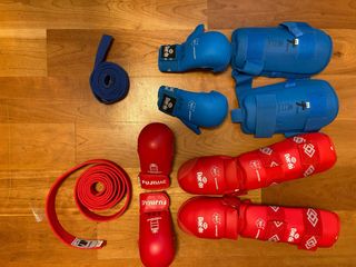Conjunto de equipación para la práctica de Karate Kumite. - Guantes de protección azules. - Empeineras azules. - Guantes de protección rojos. - Empeineras rojas. - Cinturón rojo. - Cinturón azul. - Casco.