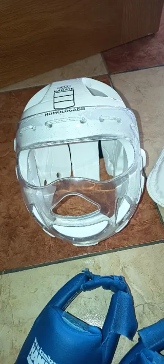 Conjunto de equipación para la práctica de karate. - Peto protector blanco de la marca Tagoya. - Casco protector transparente de la marca Ikara. - Tibiales y protectores de pie azules de la marca Adidas, con aprobación WKF.