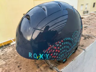 Casco de esquí de la marca Roxy, diseñado para niñas. Presenta un acabado brillante y un estampado decorativo. - Color azul marino. - Diseño con triángulos en tonos turquesa y coral. - Logo de Roxy en la parte frontal.