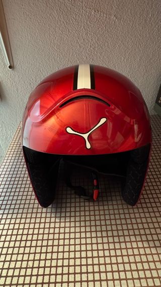 Casco de esquí de color rojo brillante con detalles de rayas blancas y negras en la parte superior. Presenta el icónico logo de Puma en blanco en la parte frontal. - Diseño deportivo. - Acabado metálico.