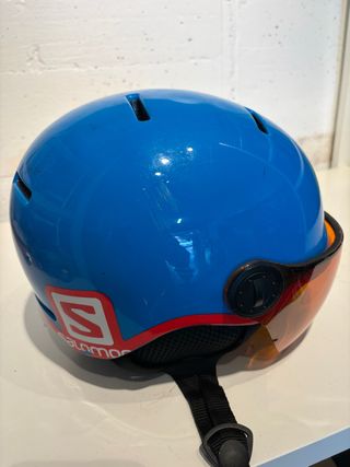 Casco de esquí para niño de la marca Salomon, con visera integrada. - Color azul brillante. - Diseño con ventilación. - Cierre de seguridad. - Logo de Salomon en el lateral.