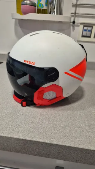 Casco de esquí Wedze con visor integrado, ideal para los más pequeños. Diseñado para ofrecer protección y comodidad en la montaña. - Color blanco con detalles en naranja. - Visor oscuro para proteger del sol y el deslumbramiento. - Sistema de ajuste para mayor seguridad. - Acolchado interior para confort.