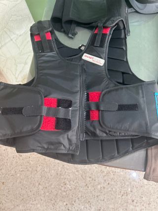 Conjunto de equitación para niñ@s de 10-11 años. Talla s - Chaleco protector negro con detalles rojos. - Casco de equitación negro. - Pantalón de montar marrón con rodilleras negras. - Botas de equitación negras. - Guantes negros.