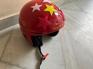 Casco de esquí infantil de la marca Quechua, en color rojo y decorado con estrellas de diferentes colores. - Diseño con estrellas rosas y amarillas. - Cierre de seguridad. - Orejeras acolchadas. Talla 52-55cm para niños de 4-10 años para ski o deportes de invierno en general