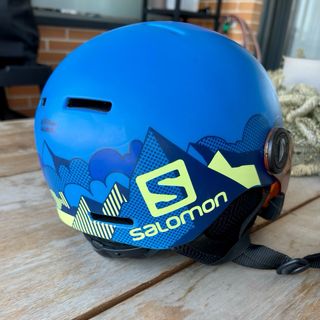 Casco de esquí infantil Salomon en color azul con detalles en verde y visor integrado abatible con lente espejada dorada. Muy práctico, ya que no necesita gafas adicionales y protege del sol y el viento. Dispone de ajuste trasero regulable, acolchado interior cómodo, orejeras suaves, ventilación superior y cierre de clip en perfecto estado. Está como nuevo, con muy poco uso y en excelente estado de conservación. Ideal para esquí o snowboard.