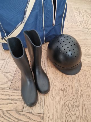 Conjunto de equitación para niños. - Botas de montar negras, talla 29. - Casco de equitación negro. - Funda para el casco.