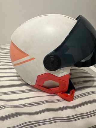 Casco de nieve para niños(7a 9 a aprox) con visera integrada. Diseñado para proteger y ofrecer comodidad en la montaña. - Visera oscura. - Correa ajustable con acolchado. - Color blanco y naranja.