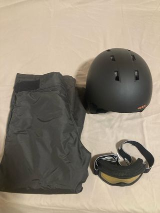 Conjunto de esquí para niño de 8 años, ideal para disfrutar de la nieve. Incluye pantalón, casco y gafas. - Pantalón de esquí negro. - Casco de esquí negro con ventilación. - Gafas de esquí negras con lente dorada. Son gama básica y hacen su uso recreativo de primer contacto de los niños con la nieve.