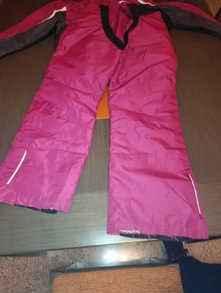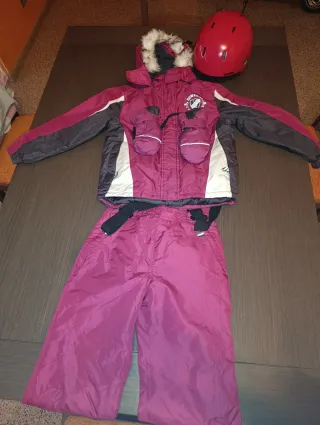 Conjunto de esquí para niña en color fucsia y detalles en gris y blanco. Incluye chaqueta y pantalón guantes y casco - Chaqueta con capucha y pelo sintético.pequeña mancha en el pecho casi no se aprecia - guantes manopla tinsulate - Pantalón con tirantes ajustables rotura en el borde inferior trasero a causa de andar y pisarselo. -casco wedze talla s como nuevo usado 2 veces